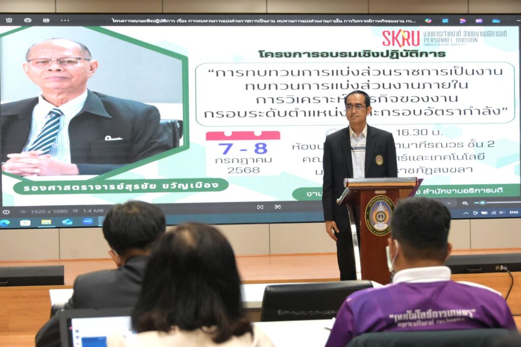 เมื่อวันที่ 7-8 กรกฎาคม 2568 งานการเจ้าหน้าที่ กองกลาง สำนักงานอธิการบดี มหาวิทยาลัยราชภัฏสงขลา (มรภ.สงขลา) จัดโครงการอบรมเชิงปฏิบัติการ เรื่อง “การทบทวนการแบ่งส่วนราชการเป็นงาน ทบทวนการแบ่งส่วนงานภายใน การวิเคราะห์ภารกิจของงาน กรอบระดับตำแหน่ง และกรอบอัตรากำลัง” ณ ห้องประชุม คณะวิทยาศาสตร์และเทคโนโลยี มรภ.สงขลา โดยมี ผศ.พิเชษฐ์ จันทวี รักษาราชการแทนอธิการบดี มรภ.สงขลา เป็นประธานในพิธีเปิด กล่าวรายงานโดย ผศ.ดร.กันตภณ มะหาหมัด รองอธิการบดีฝ่ายบริหารและพัฒนาหน่วยงาน ได้รับเกียรติจาก รศ.สุรชัย ขวัญเมือง ผู้ทรงคุณวุฒิจากคณะกรรมการบริหารงานบุคคลใน มรภ.สงขลา เป็นวิทยากรถ่ายทอดความรู้แก่ผู้บริหารและหัวหน้าหน่วยงาน บุคลากรงานการเจ้าหน้าที่และบุคลากรที่เกี่ยวข้อง