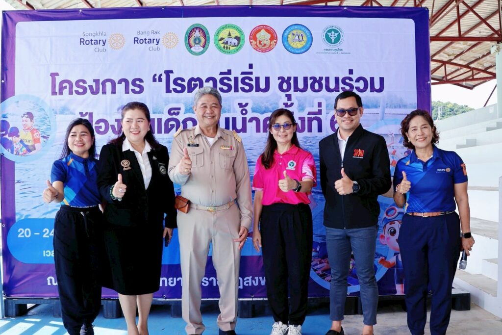 สโมสรโรตารีสงขลา ร่วมกับมหาวิทยาลัยราชภัฏสงขลา (มรภ.สงขลา) จัดโครงการ “โรตารีเริ่ม ชุมชนร่วม ป้องกันเด็กจมน้ำ ครั้งที่ 6” ระหว่างวันที่ 20-24 ตุลาคม 2568 ณ สระว่ายน้ำ มรภ.สงขลา เพื่อสร้างความรู้และพัฒนาทักษะการว่ายน้ำให้กับเด็กและเยาวชนในพื้นที่อำเภอเมืองสงขลา จังหวัดสงขลา เสริมสร้างทักษะการว่ายน้ำแก่เยาวชน ให้สามารถช่วยเหลือตนเองและผู้อื่นได้ ปลอดภัยจากอุบัติเหตุทางน้ำ ภายใต้แนวคิด “ตะโกน โยน ยื่น” โดยได้รับเกียรติจาก ผศ.พลากร นัคราบัณฑิต ผู้ช่วยอธิการบดี มรภ.สงขลา เข้าร่วมดำเนินกิจกรรมและร่วมสอนด้วยตนเอง และมี นายศรัณยู มุขวรรณ์ รองนายกเทศมนตรีเมืองเขารูปช้าง ร่วมเปิดโครงการ สร้างความประทับใจแก่เด็กและเยาวชนที่เข้าร่วม สะท้อนให้เห็นถึงพลังความร่วมมือระหว่างภาคการศึกษาและภาคประชาสังคมในการยกระดับความปลอดภัยของชุมชน