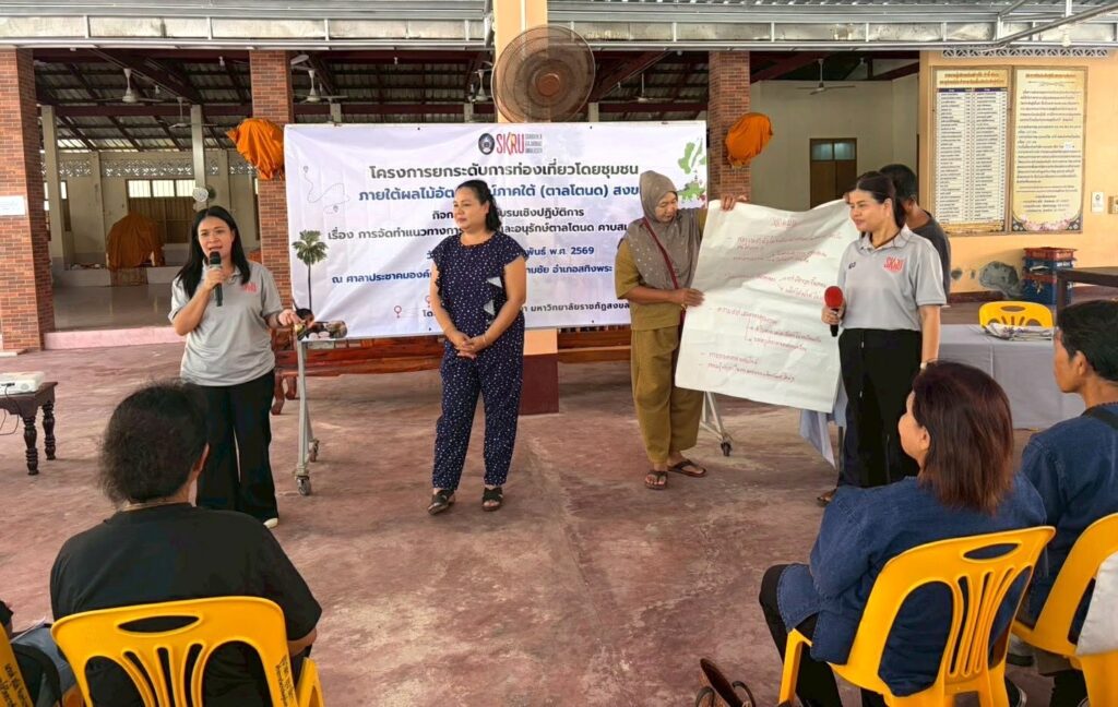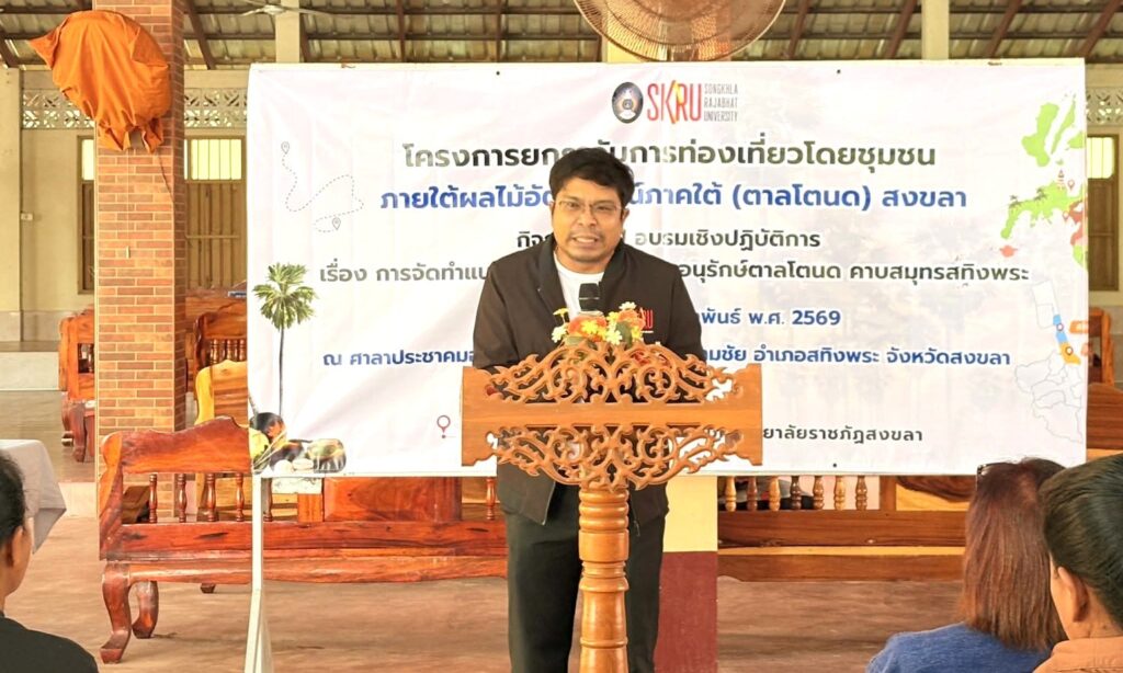 เมื่อวันที่ 12 กุมภาพันธ์ 2569 สถาบันวิจัยและพัฒนา มหาวิทยาลัยราชภัฏสงขลา (มรภ.สงขลา) ลงพื้นที่จัดโครงการอบรมเชิงปฏิบัติการ เรื่อง “การจัดทำแนวทางการพัฒนาและอนุรักษ์ตาลโตนด คาบสมุทรสทิงพระ” ณ วัดประดิษฐ์สโมสร (วัดสนามชัยออก) ตำบลสนามชัย อำเภอสทิงพระ จังหวัดสงขลา โดย ผศ.พิเชษฐ์ จันทวี อธิการบดี มรภ.สงขลา ได้มอบหมายให้ รศ.ดร.วีระชัย แสงฉาย รองอธิการบดีฝ่ายวิชาการและวิจัย เป็นประธานกล่าวเปิดงาน พร้อมเน้นย้ำบทบาทของมหาวิทยาลัยในการบูรณาการองค์ความรู้ด้านวิชาการ งานวิจัย และการบริการวิชาการ เพื่อสนับสนุนการอนุรักษ์และต่อยอดภูมิปัญญาท้องถิ่นให้เกิดคุณค่าทางเศรษฐกิจ สังคม และวัฒนธรรม ควบคู่กับการดูแลทรัพยากรธรรมชาติอย่างสมดุล