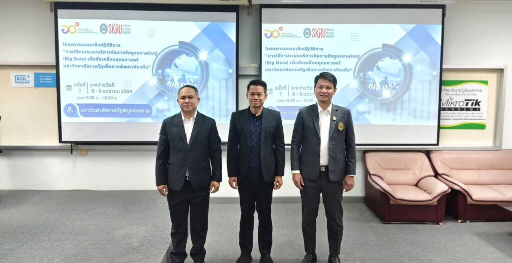วันที่ 8-9 มกราคม 2569 ผศ.พิเชษฐ์ จันทวี อธิการบดีมหาวิทยาลัยราชภัฏสงขลา (มรภ.สงขลา) มอบหมายให้ ทีมบุคลากรงานนโยบายและยุทธศาสตร์ กองนโยบายและแผน สำนักงานอธิการบดี มรภ.สงขลา ประกอบด้วย นางสโรชา บริสุทธิ์ นักวิเคราะห์นโยบายและแผนชำนาญการ นางกฤชณัท พงศ์จันทรเสถียร และ นางวิภาวี โสตถิพันธุ์ เจ้าหน้าที่บริหารงานทั่วไป จัดโครงการอบรมเชิงปฏิบัติการการใช้งานระบบบริหารจัดการข้อมูลขนาดใหญ่ (Big Data) เพื่อขับเคลื่อนยุทธศาสตร์มหาวิทยาลัยราชภัฏเพื่อการพัฒนาท้องถิ่น ครั้งที่ 7 ณ ห้อง COMPUTER LAB 106 ชั้น 1 สถาบันเทคโนโลยีดิจิทัล มหาวิทยาลัยราชภัฏพิบูลสงคราม (ส่วนทะเลแก้ว) จังหวัดพิษณุโลก ในการนี้ ผศ.ดร.ชุมพล เสมาขันธ์ อธิการบดี มรภ.พิบูลสงคราม ได้มอบหมายให้ รศ.ดร.โชติ บดีรัฐ รองอธิการบดีฝ่ายแผนและยุทธศาสตร์ เป็นประธานในพิธีเปิด