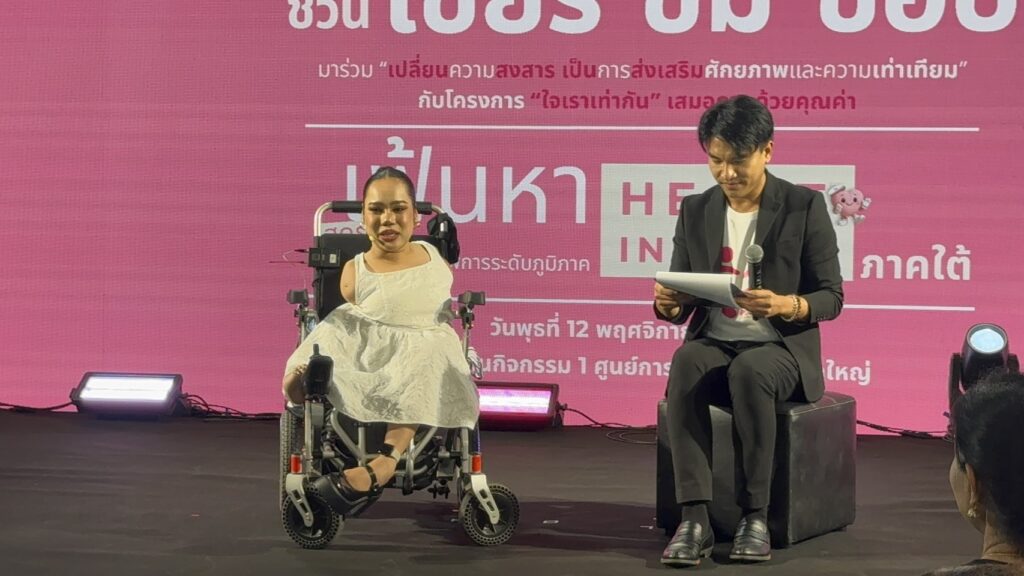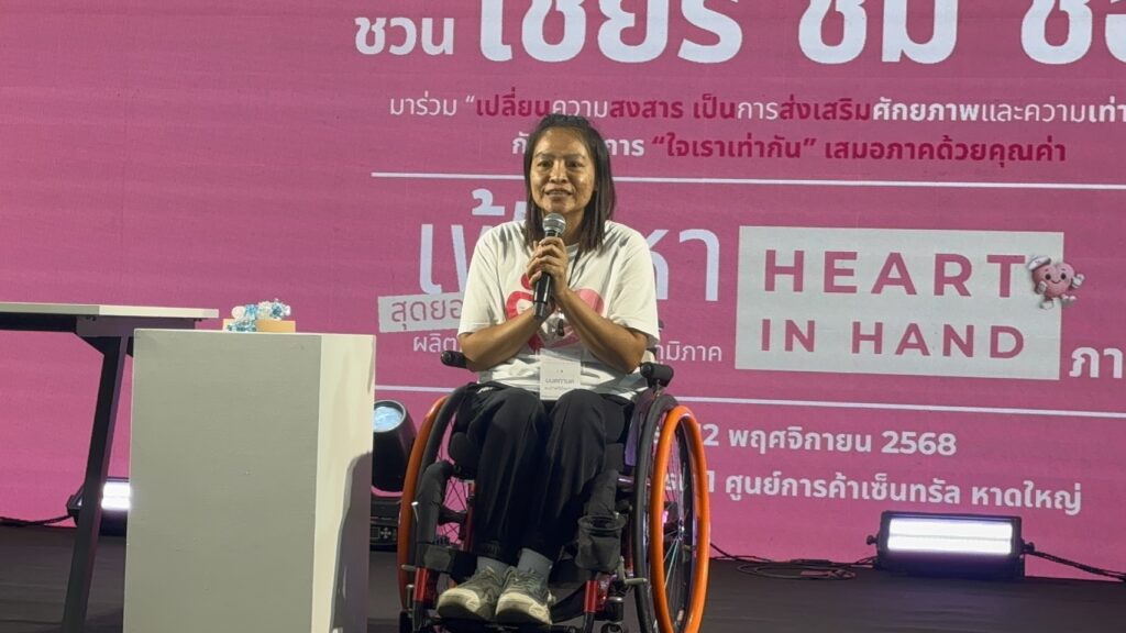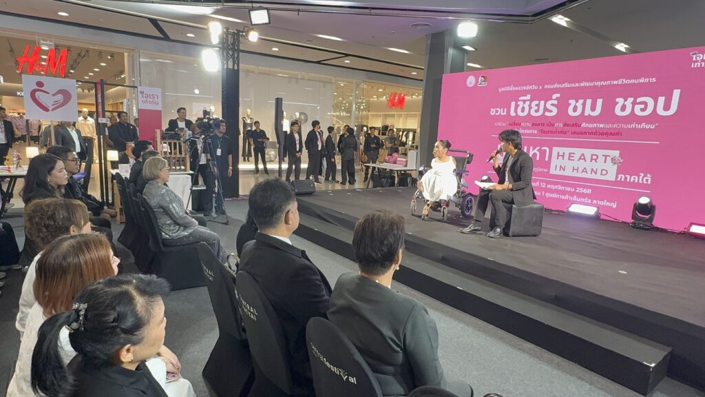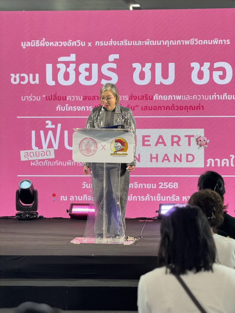 วันที่ 12 พฤศจิกายน 2568  มูลนิธิผึ้งหลวง อัศวิน ร่วมกับกรมส่งเสริมและพัฒนาคุณภาพชีวิตคนพิการ เปิดเวทีประกวดระดับภูมิภาค ภาคใต้ ภายใต้โครงการ “ใจเราเท่ากัน เสมอภาคด้วยคุณค่า” เพื่อเฟ้นหาสุดยอดผลิตภัณฑ์คนพิการ “Heart in Hand” จัดขึ้น ณ ศูนย์การค้าเซ็นทรัลหาดใหญ่ จังหวัดสงขลา โดยมี ดร.หม่อมหลวงณฐภา กิติยากร ประธานกรรมการมูลนิธิฯ และประธานที่ปรึกษาโครงการ เป็นประธานเปิดงาน พร้อมประกาศเจตนารมณ์สร้างพื้นที่แห่งโอกาสให้คนพิการได้แสดงศักยภาพและสร้างคุณค่าทางเศรษฐกิจอย่างเท่าเทียม ในโครงการ “Heart in Hand – สร้างคุณค่าจากใจ ถึงมือคุณ” มุ่งส่งเสริมศักยภาพและอาชีพของคนพิการทั่วประเทศ ผ่านกิจกรรม Workshop และ Online Mentor โดยผู้เชี่ยวชาญจากหลากหลายสาขา อาทิ รศ.ดร.เสรี วงษ์มณฑา, หม่อมราชวงศ์ ปิยฉัตร ฉัตรชัย, ดร.สุทัศน์ รงรอง, คุณศรัญญ อยู่วงดี และคณะอาจารย์จากมหาวิทยาลัยศิลปากร เพื่อพัฒนาผลงานคนพิการทั้ง 7 ประเภท ให้สามารถต่อยอดสู่ตลาดจริงอย่างยั่งยืน สำหรับการประกวดระดับภูมิภาค