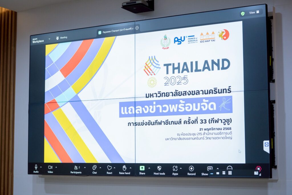 มหาวิทยาลัยสงขลานครินทร์ แถลงข่าวพร้อมจัดการแข่งขันกีฬาซีเกมส์ ครั้งที่ 33 ประเภทกีฬาวูซู ในระหว่างวันที่ 13-15 ธันวาคม 2568 ณ สนามการแข่งขันศูนย์ประชุมนานาชาติฉลองสิริราชสมบัติครบ ๖๐ ปี โดยมี 10 ชาติร่วมชิงชัย 14 เหรียญทอง