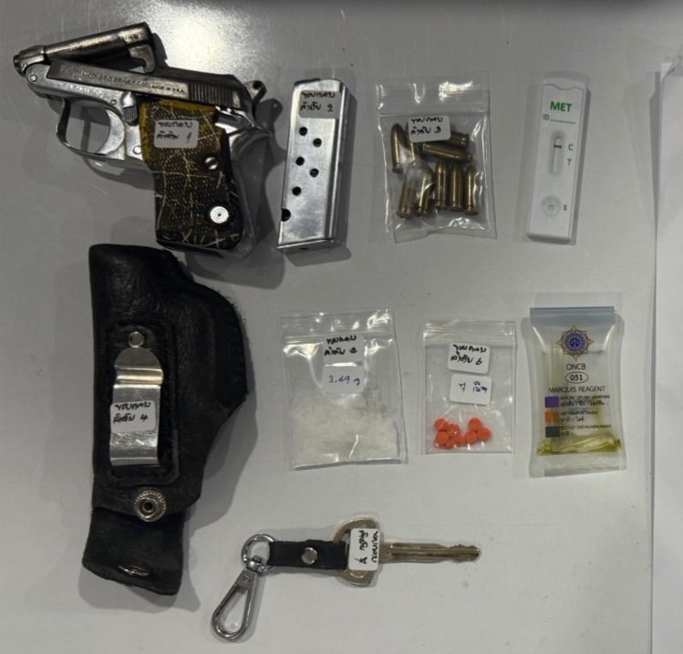 ตำรวจท่องเที่ยวจับหนุ่มตามหมายจับพร้อมพบอาวุธปืน กระสุนปืน ยาเสพติด เพียบ ช่วงระดมกวาดล้าง