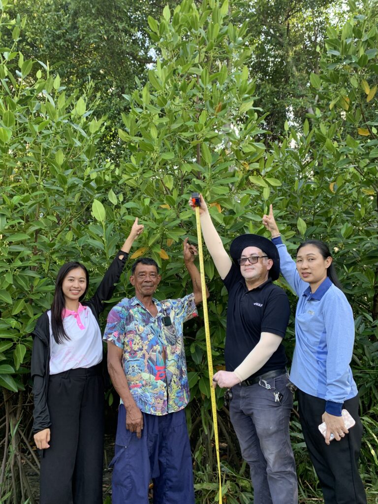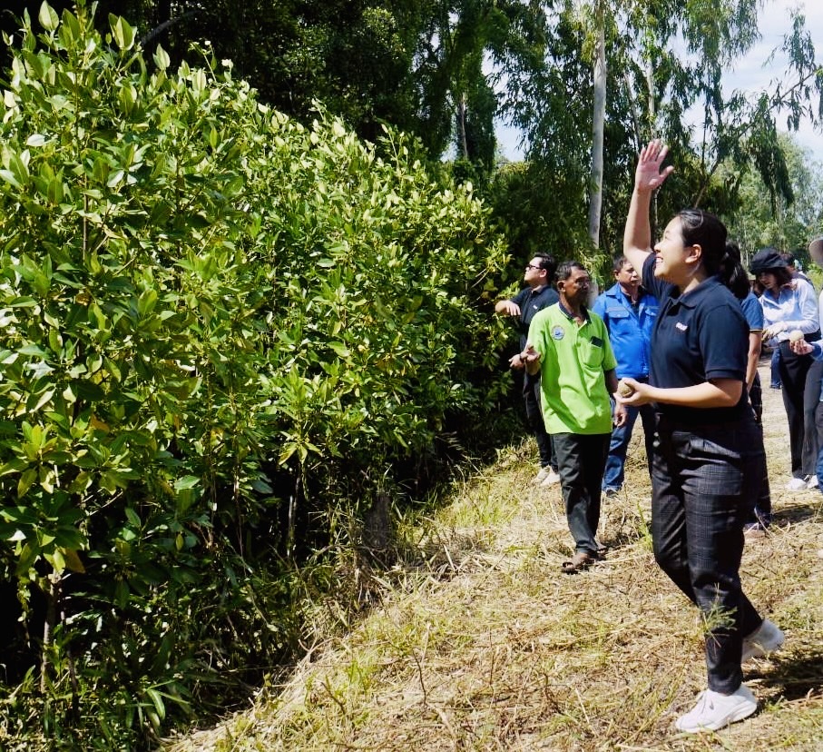 สำหรับกิจกรรมในวันนี้ มีการสรุปผลการติดตามประเมินผลการดำเนินงานโครงการฯที่ผ่านมา 3 ปี ตั้งแต่ ปี 2565 -2568 โดย ดร.กฤษณ์ พงษ์เทพิน (GULF) ได้กล่าวรายงานผลการติดตามพื้นที่ป่าชายที่ที่ได้ร่วมกันฟื้นฟูฯตั้งแต่ปี 2565 ผลดำเนินการมากว่า 3 ปี ที่ผ่านมา พบว่ามีความสำเร็จเกิดขึ้น ดังนี้ 1) สามารถพื้นฟูพื้นที่ป่าชายเลนที่เสื่อมโทรมและไม่มีต้นไม้ป่าชายเลนขึ้นอยู่เลย โดยการปรับสภาพดินน้ำและเสริมธาตุอาหารกล้าไม้ที่ปลูก ด้วยจุลินทรีย์ รวมกว่า 2,000 ต้น ต้นกล้าไม้ที่ปลูก มีอัตราการรอดสูง กว่า 80-90 % และเติบโตจากเริ่มปลูกสูง 50 เซนติเมตร สูงขึ้นเป็น 4 เมตร และด้านกายภาพสังเกตได้ว่ามีการเปลี่ยนแปลงในเชิงบวก คือ มีการเแตกของรากหลัก กิ่งก้าน ลำต้นขยายมากขึ้นสังเกตว่ามีการแทงรากแข็งแรงค้ำลำต้นมากขึ้นด้วยเติบโตแข็งแรงเป็นส่วนใหญ่ กว่า 80 % โดยประมาณ ซึ่งคณะผู้เข้าร่วมกิจกรรมในวันนี้ได้ร่วมติดตามและนำจุลินทรีย์ก้อนและจุลินทรีย์ชนิดน้ำ ไปร่วมกันใส่ในบริเวณแปลงฟื้นฟูร่วมกัน ด้วย 2) ด้านความเข้มแข็งของชุมชน มีการส่งเสริมวิสาหกิจชุมชนกลุ่มประมงเรือเล็กหาดสุชาดา อบรมความรู้ด้านจุลินทรีย์ชีวภาพ และ จัดตั้งศูนย์เรียนรู้และธนาคารจุลินทรีย์ชุมชนผลิตจุลินทรีย์รูปแบบต่างๆใช้ฟื้นฟูระบบนิเวศป่าชายเลน ต้นกล้าป่าชายเลน การนำไปใช้ทางการเกษตร ครัวเรือน ฯลฯ และเกิดผลสำเร็จด้านเศรษฐกิจชุมชน โดยชุมชนสามารถนำความรู้มาพัฒนาสินค้าชุมชน ผลิตภัณฑ์จากจุลินทรีย์ชีวภาพ เช่น ปุ๋ยหมัก ปุ๋ยน้ำชีวภาพ ฮอล์โมนปลาทะเลหมัก จุลินทรีย์ก้อน ฯลฯ เกิดการสร้างรายได้แก่ชุมชนแล้วด้วย ซึ่งจะเป็นกลไกการพัฒนาที่ขับเคลื่อนเศรษฐกิจ และสิ่งแวดล้อมควบคู่กันอย่างมีประสทธิภาพมากยิ่งขึ้นได้ต่อไป